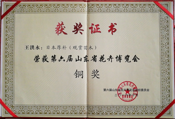 我公司培育的日本厚樸在第六屆山東省花卉博覽會上喜獲銅獎。