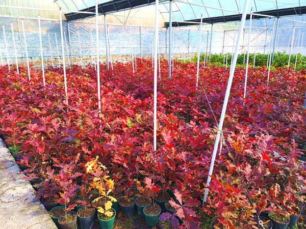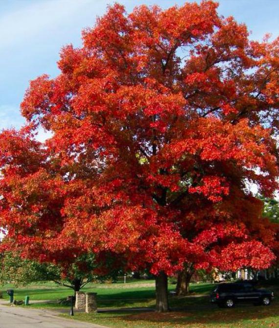 該樹種為落葉大喬木,根系發(fā)達(dá),樹冠濃密,樹枝舒展,樹冠成自然塔狀。樹葉春夏墨綠色,葉列較深,與沼生櫟葉片近似。初秋少量葉片變成亮紅色,逐漸整株葉片均為火紅色,頗為美觀。紅葉期在山東地區(qū)持續(xù)將近兩個(gè)月,在個(gè)別的區(qū)紅葉期可達(dá)到元旦左右。據(jù)湖北荊門、四川成都客戶反映,在他們那邊紅葉期將近三個(gè)月。這是迄今為止我們引進(jìn)彩色苗木中觀賞期最長的一個(gè)品種。